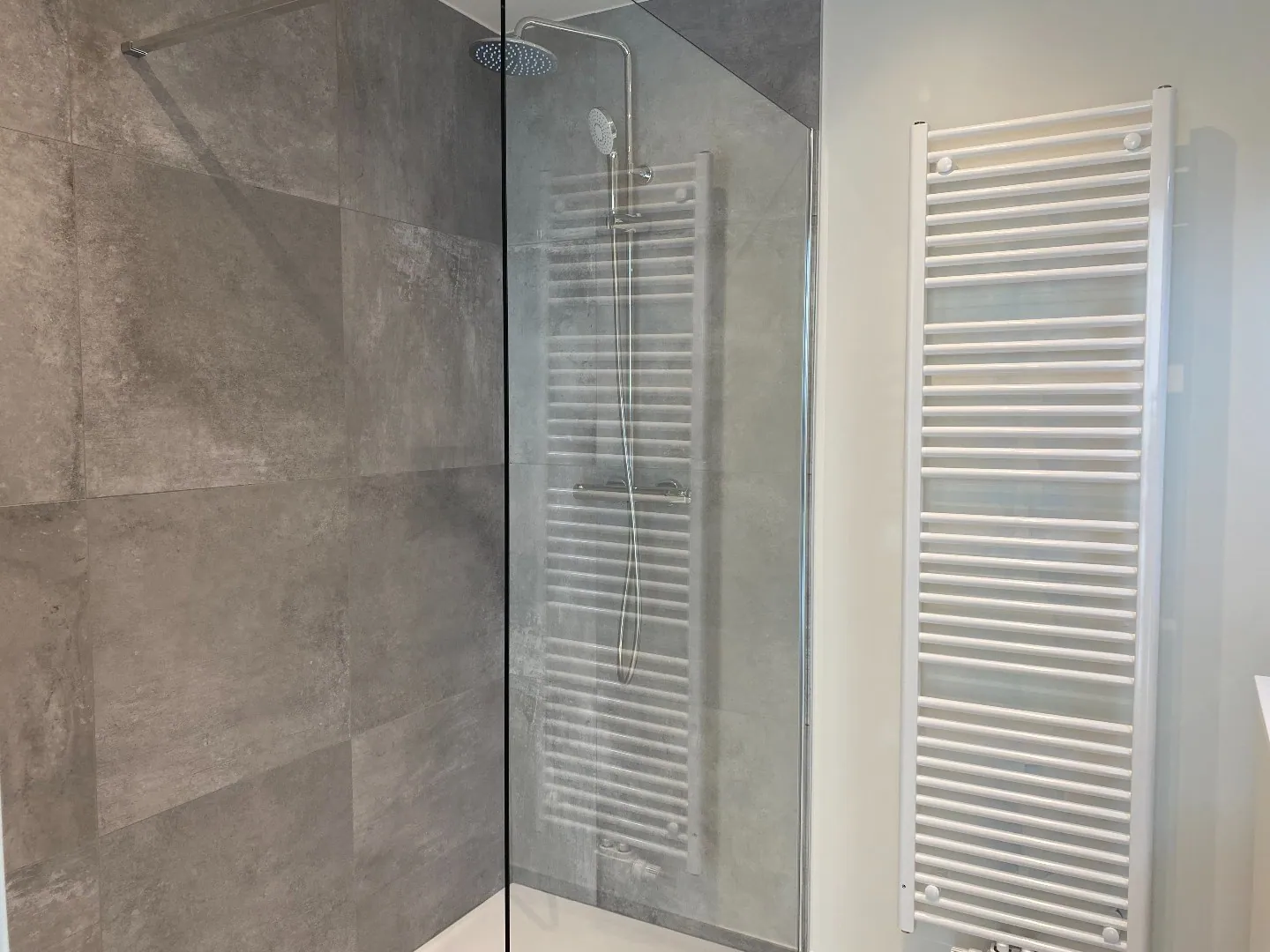 Badkamer met inloopdouche, lavabomeubel en handdoekradiator