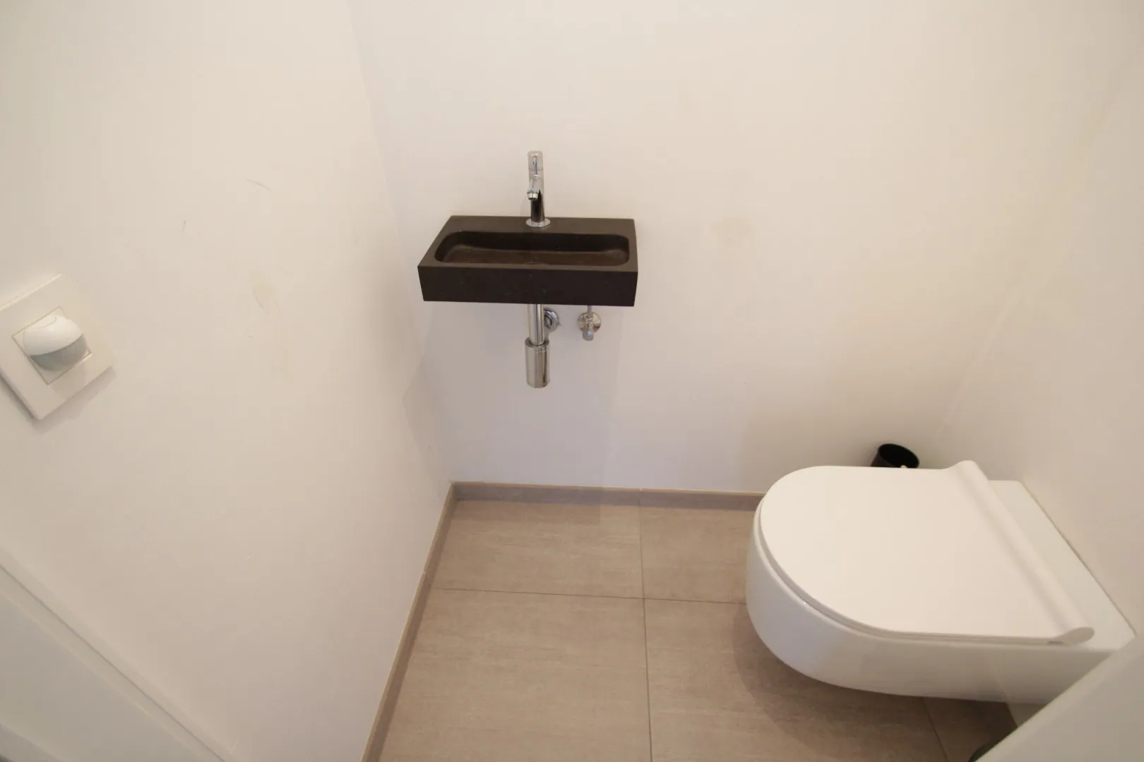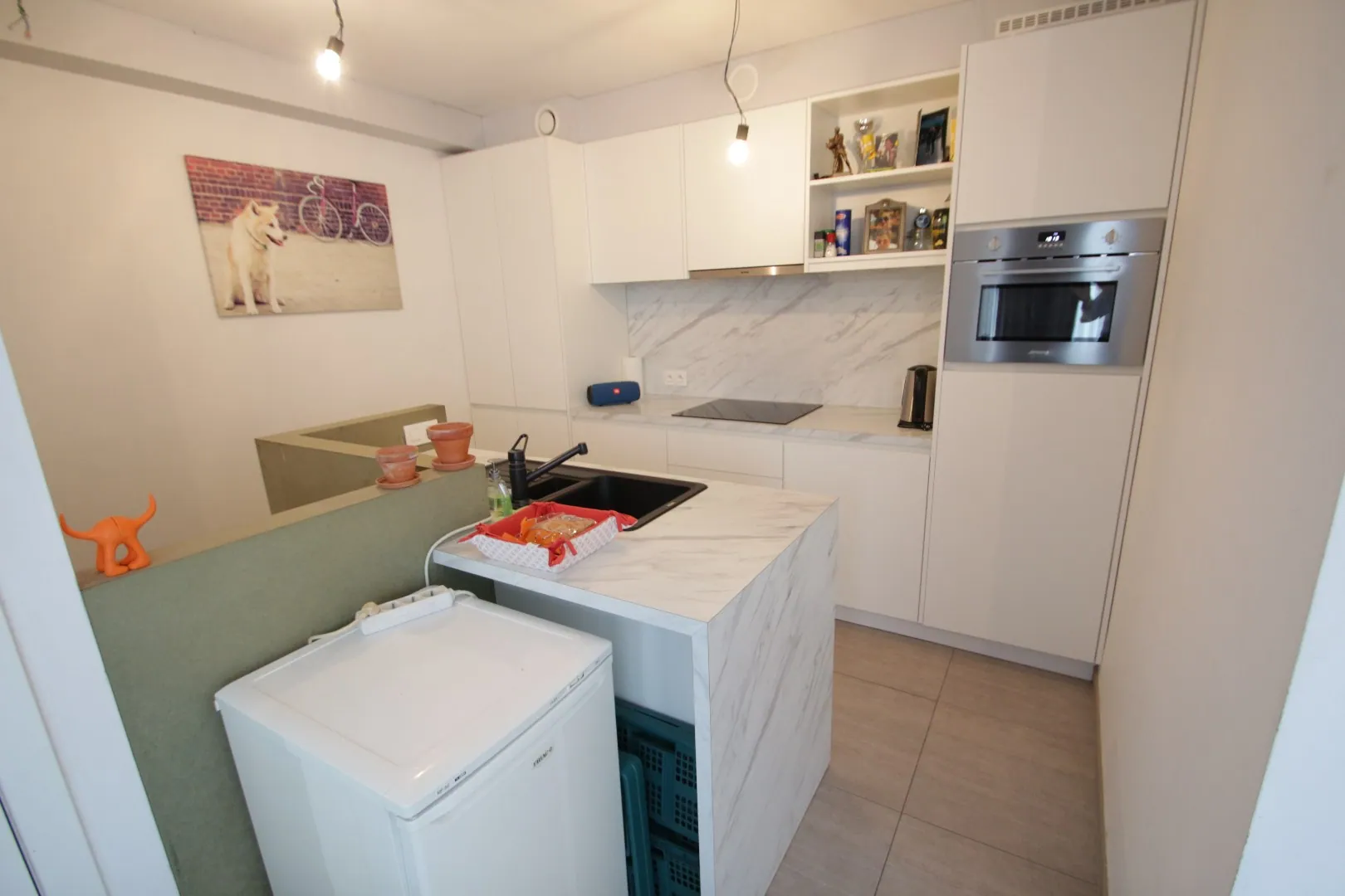 Inkomhal met gastentoilet, volledig ingerichte open keuken met praktische berging, lichtrijke woonkamer met aparte eet- en zithoek, badkamer met toilet en één volwaardige slaapkamer.