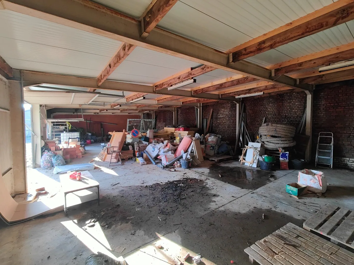 In het centrum van Ardooie bieden wij een ruime loods aan van 224 m². De ruimte is voorzien van vaste verlichting en elektriciteitsaansluiting. Er zijn twee inrijpoorten aanwezig, waarvan één voldoende hoog is om met een camionet binnen te rijden.