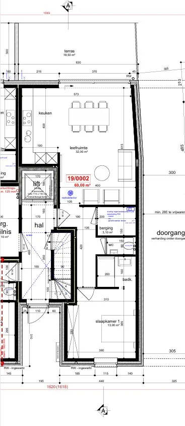 Dit gelijkvloers appartement heeft een bewoonbare oppervlakte van 60,00 m² en beschikt over één slaapkamer. Het appartement beschikt over een terras van 18,50 m² en een privatieve tuin van 70 m², gelegen aan de achterzijde van het gebouw.