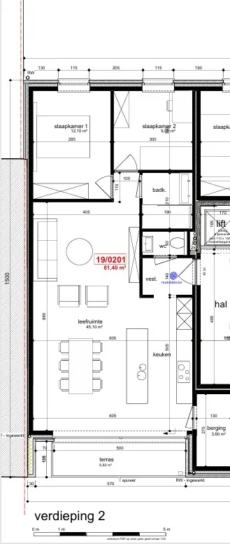 Dit appartement op de tweede verdieping heeft een bewoonbare oppervlakte van 81,40 m² en beschikt over twee slaapkamers. Het appartement beschikt over een terras van 6,60 m² aan de voorzijde van het gebouw.