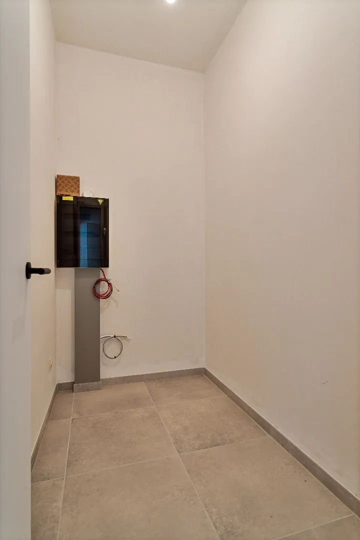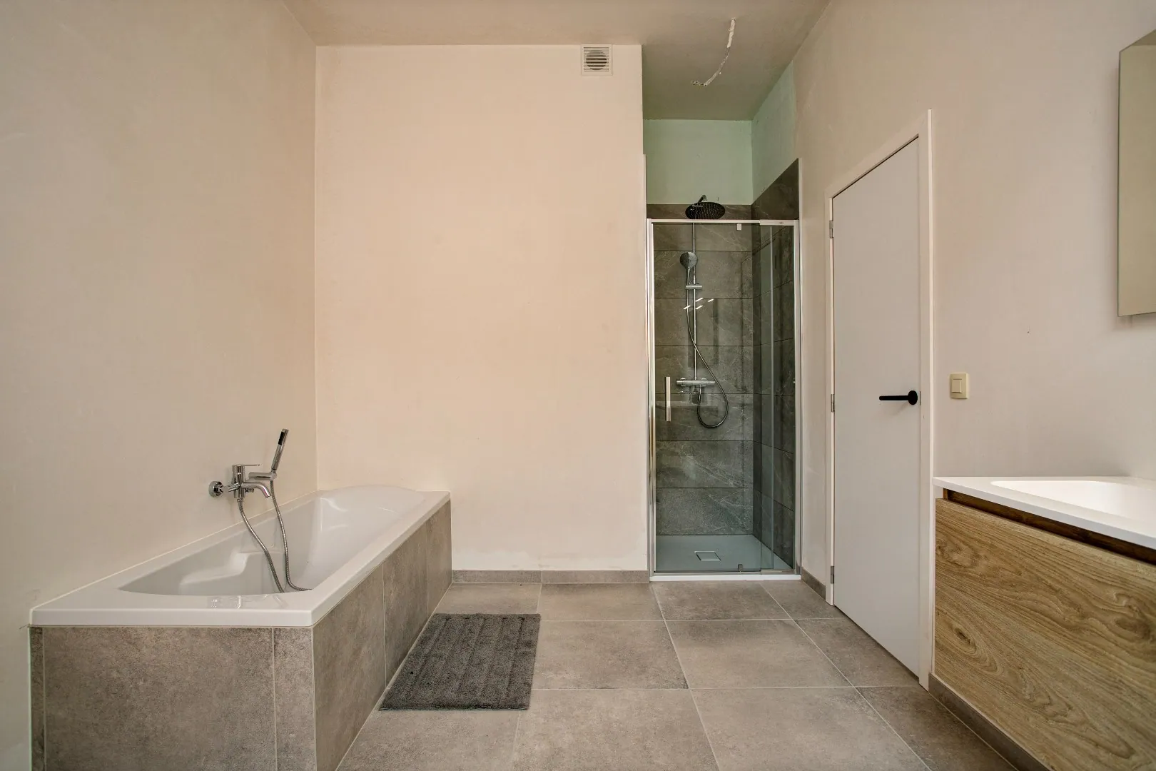 Indeling: Er is een ruime inkomhal die toegang geeft tot een aparte berging, de leefruimte, de open keuken en het terras. Via de open keuken heb je overigens toegang tot een tweede bergruimte. Daarnaast is er ook een ruime nachthal die toegang geeft tot het toilet, de badkamer en de twee slaapkamers. De badkamer bestaat uit een douche, een ligbad en een dubbele lavabo.