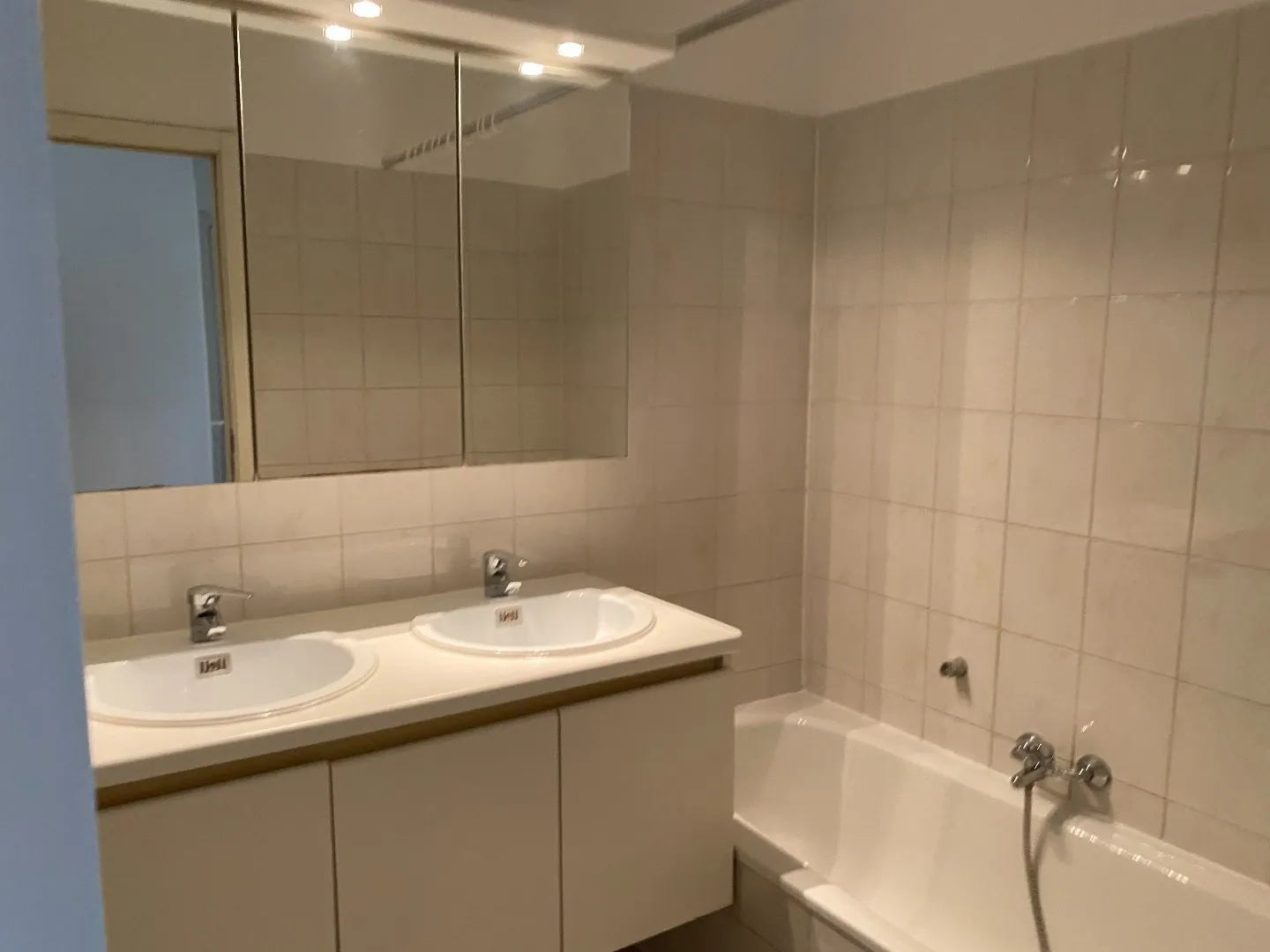 - badkamer met dubbele lavabo en ligbad.