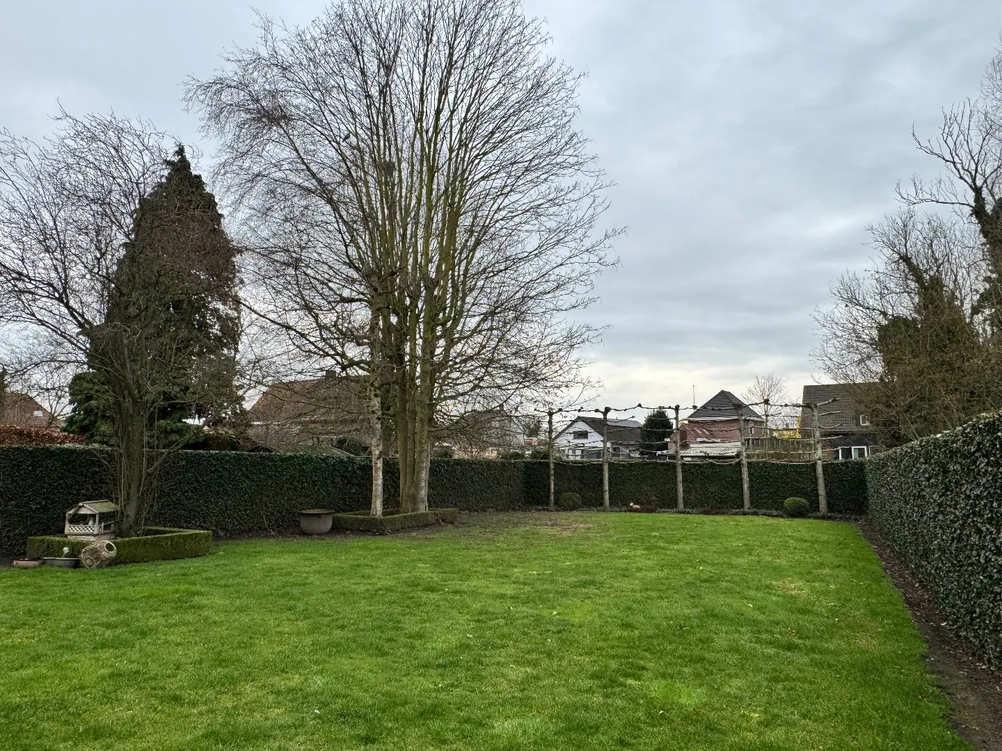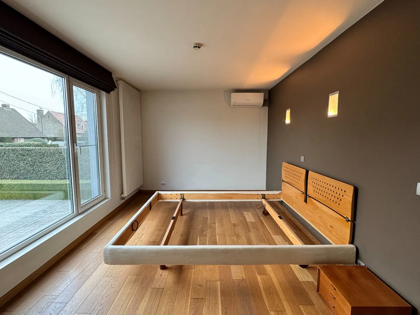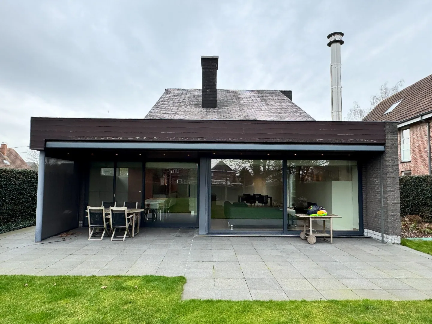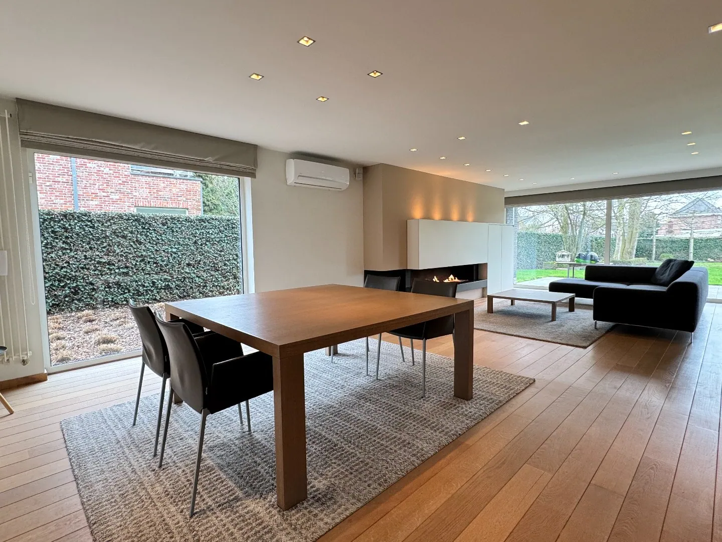 De leefruimte is lichtrijk en biedt dankzij de grote raampartijen een aangenaam zicht op de tuin. De massieve parket zorgt voor een warme uitstraling, terwijl de open gashaard een sfeervol accent toevoegt.