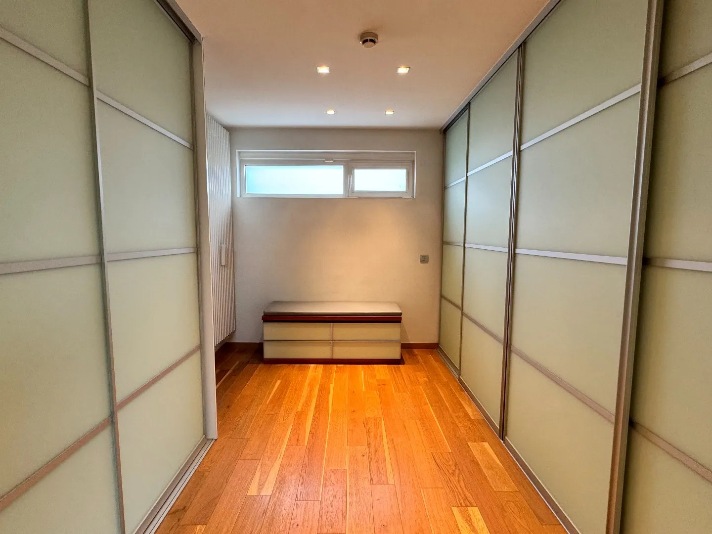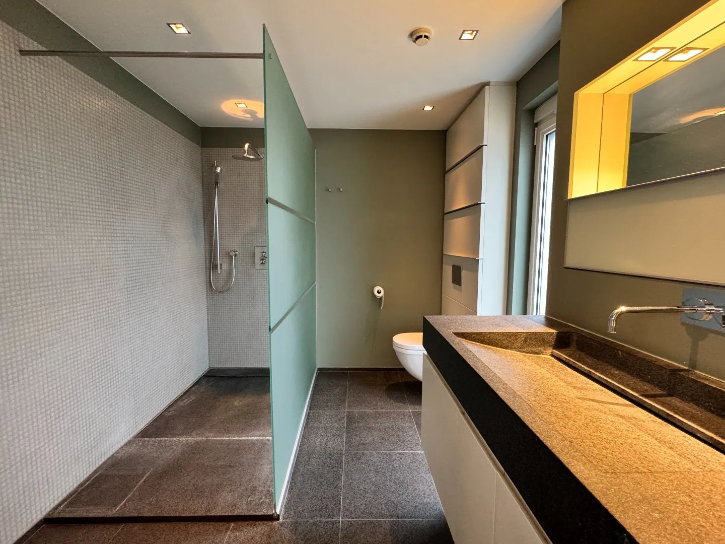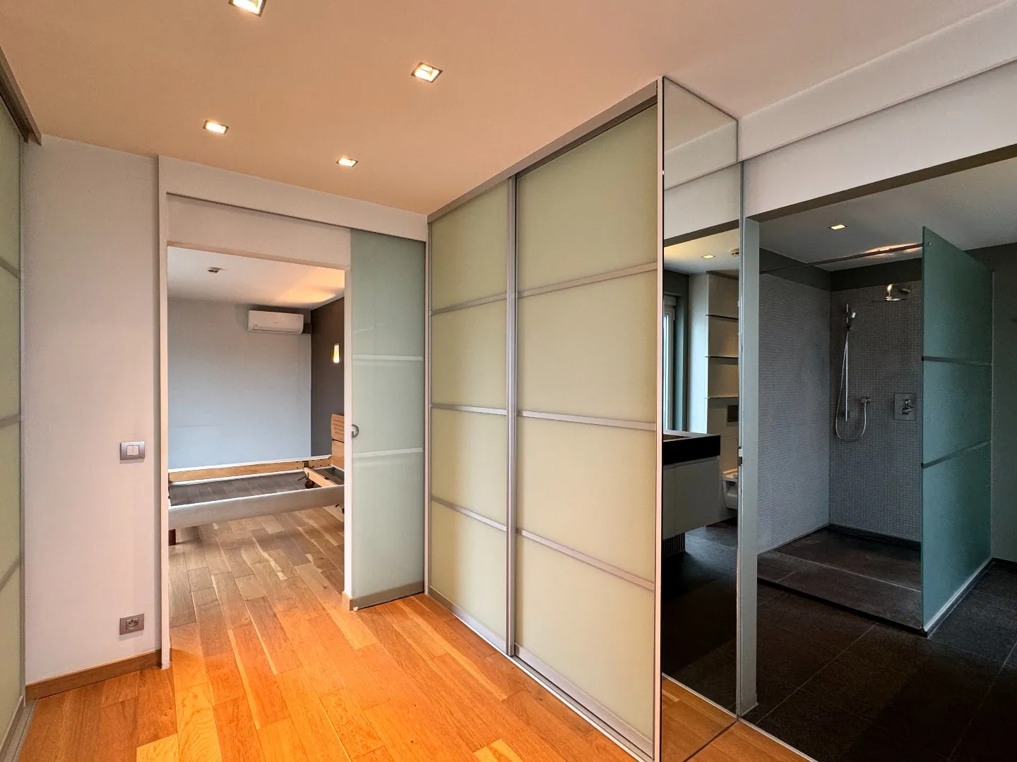 Op het tussenniveau bevindt zich de masterbedroom met ensuite dressing en een eerste badkamer, uitgerust met toilet, inloopdouche en lavabo. Op dit niveau is eveneens een bureauruimte voorzien, die ook als extra slaapkamer kan worden ingericht.