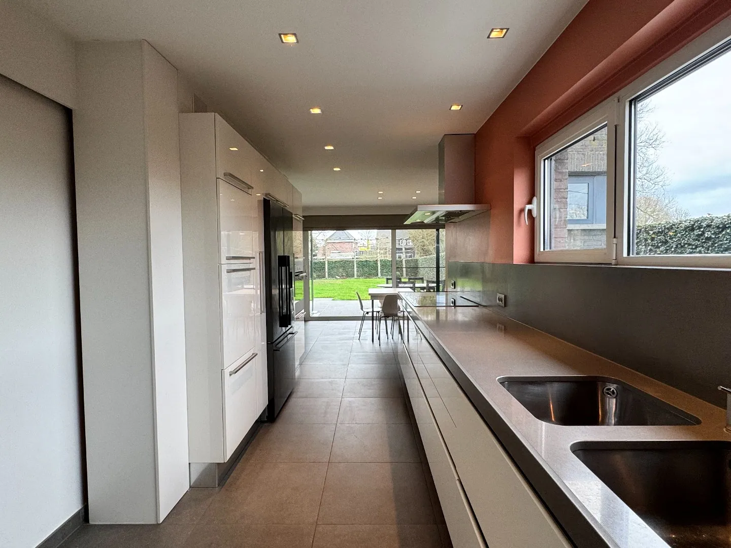 De keuken sluit aan op de leefruimte en is praktisch ingericht. Het schuifraam geeft toegang tot het overdekte terras, waardoor u in elk seizoen comfortabel buiten kan zitten. Een bijkomende zijdeur zorgt voor een extra verbinding met de tuin en oprit.