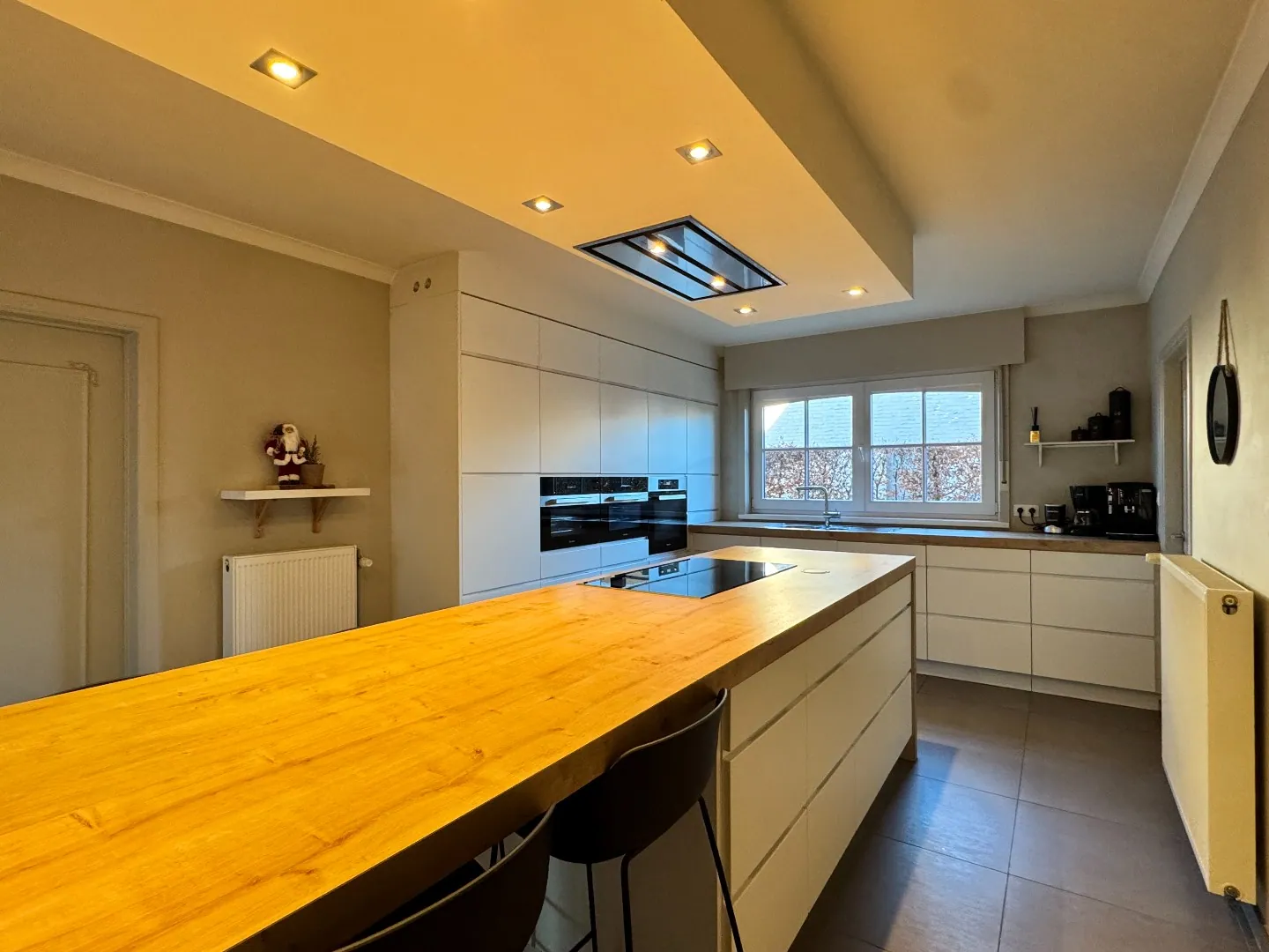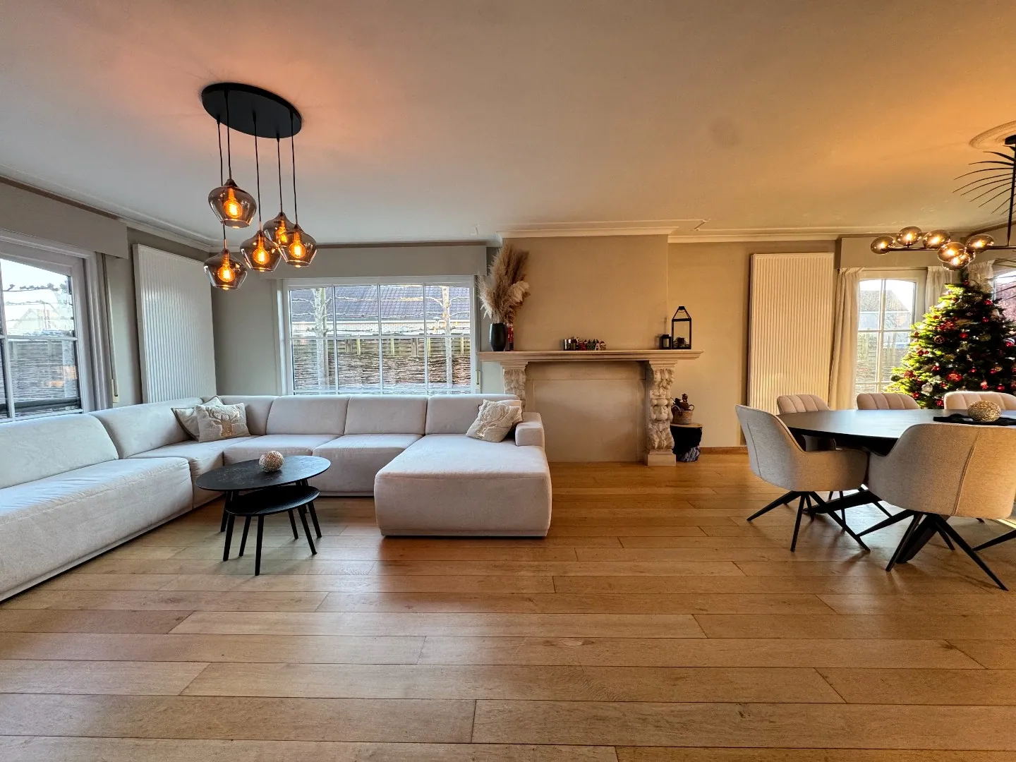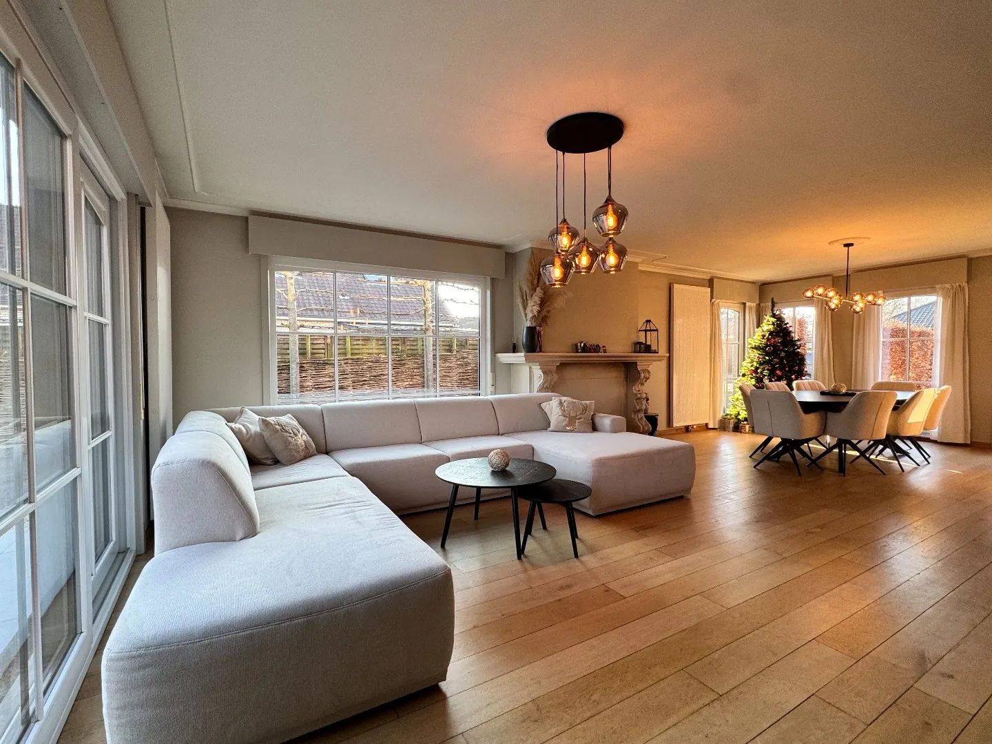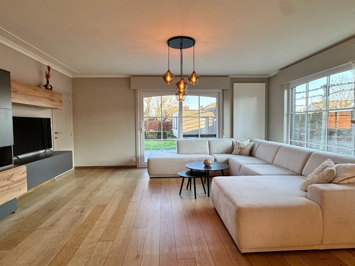 De lichtrijke leefruimte vormt het hart van de woning en biedt een mooi zicht op de tuin, waardoor u steeds verbonden blijft met het buitengebeuren.