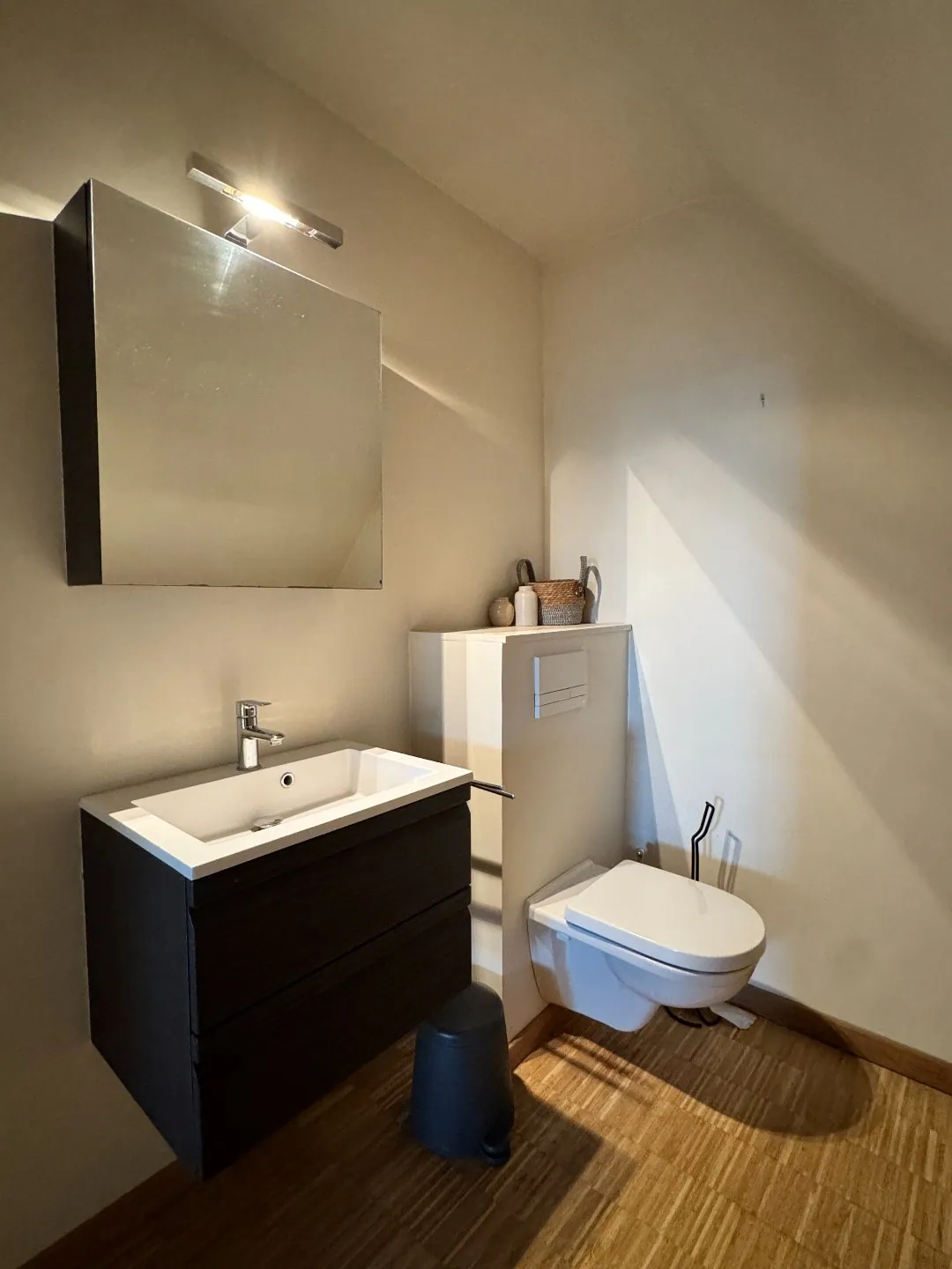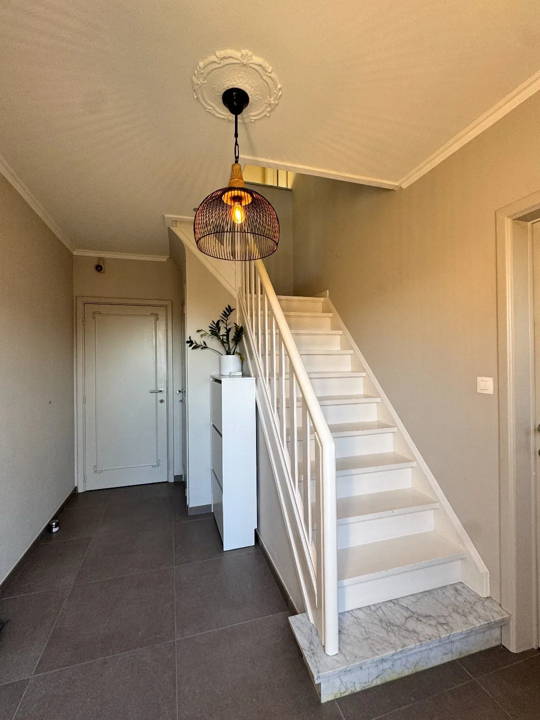 Bij het binnenkomen van de woning komt u in de inkomhal die toegang biedt tot een eerste gelijkvloerse kamer, ideaal als bureau of extra slaapkamer. Verder bereikt u via de inkomhal de keuken, een praktische berging onder de trap en de leefruimte.