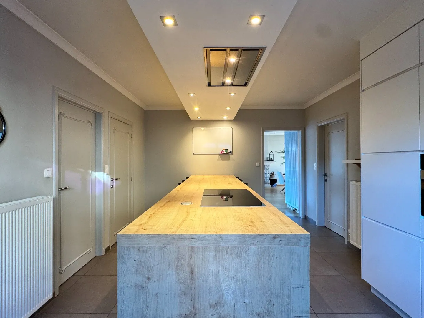 Aansluitend bevindt zich de ruime keuken, waar het grote keukeneiland centraal staat. De keuken is kwalitatief uitgerust met onder andere een microgolf, stoomoven en oven, een vaatwasser en een ingebouwde koelkast. Vanuit de keuken heeft u toegang tot een extra berging/technische ruimte, de badkamer met dubbele lavabo en inloopdouche, een apart toilet en een deur naar buiten.