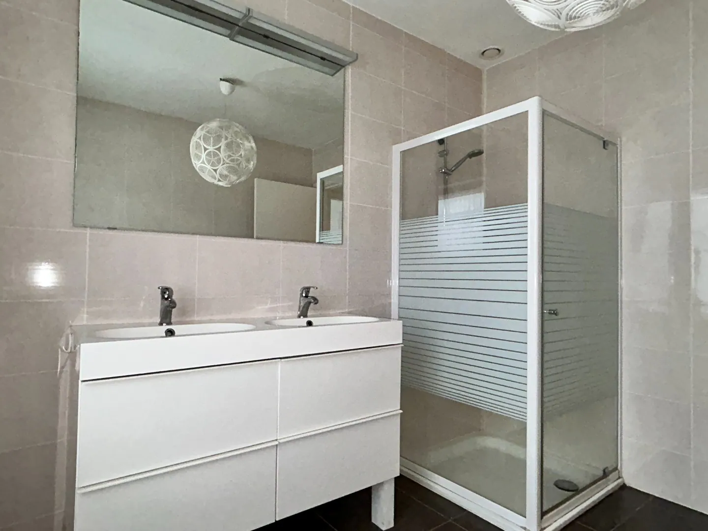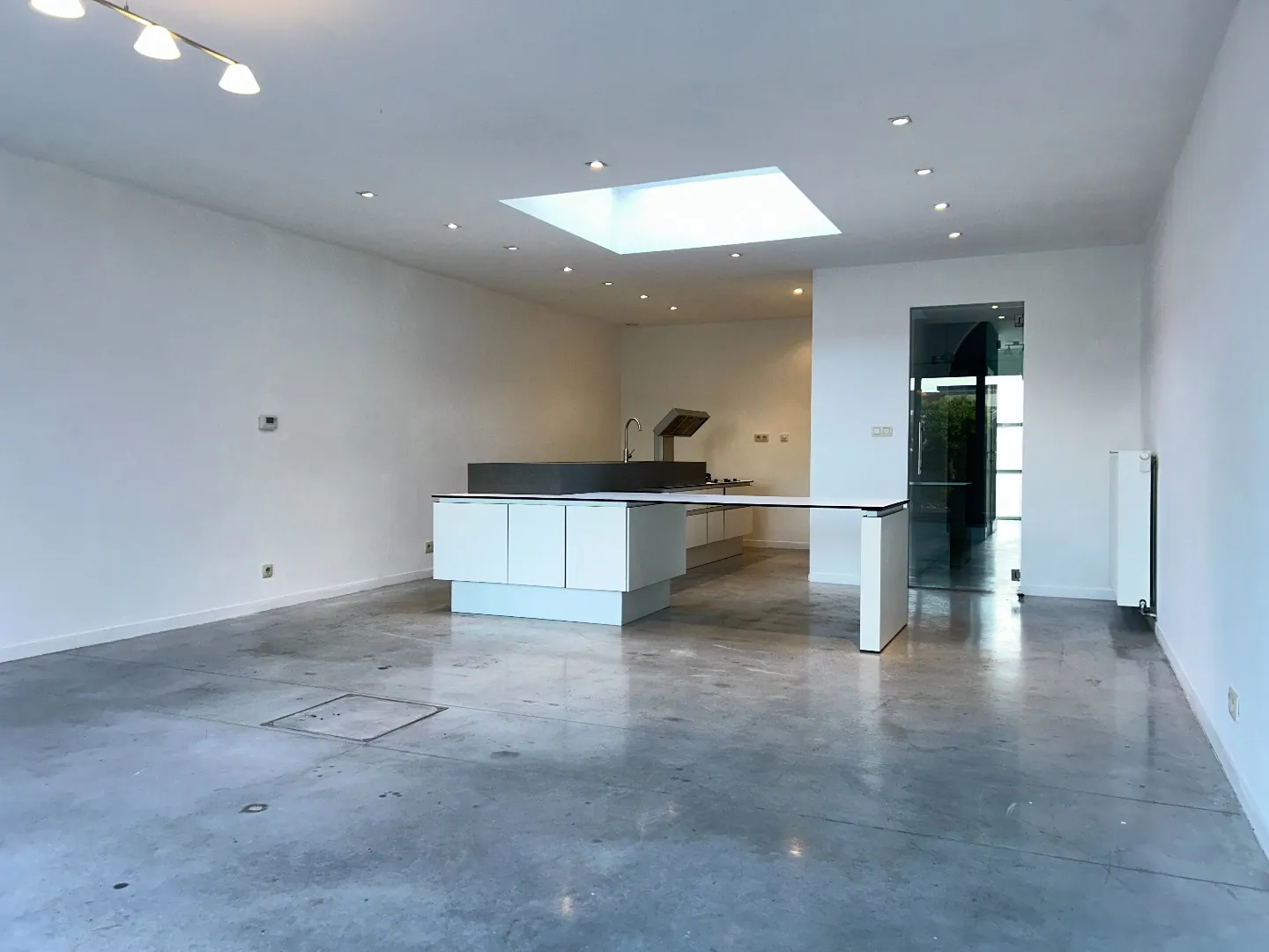 Inkomhal met gastentoilet en vestiaire, moderne open leefkeuken (met alle nodige toestellen) met aangename en lichtrijke leefruimte.