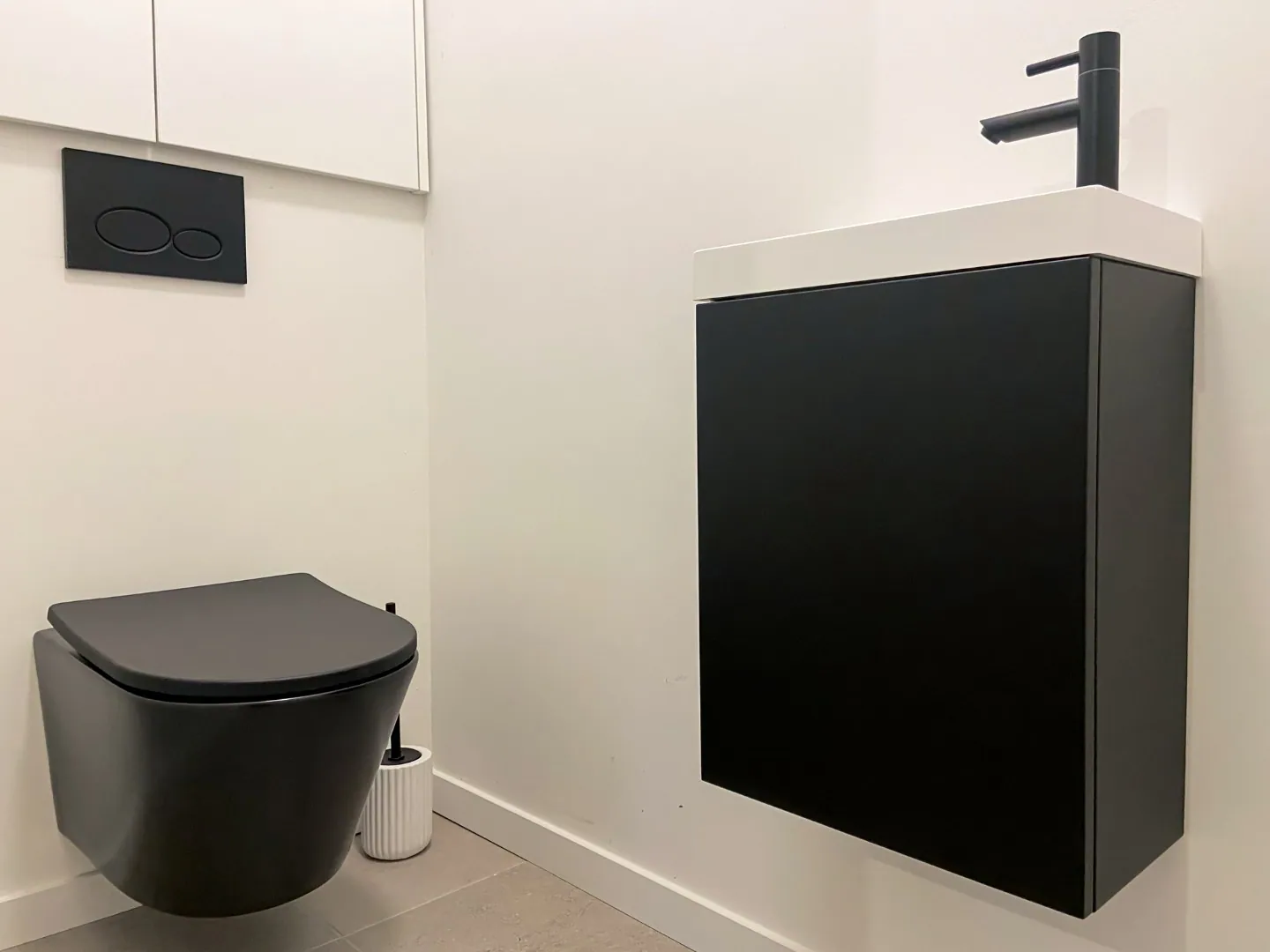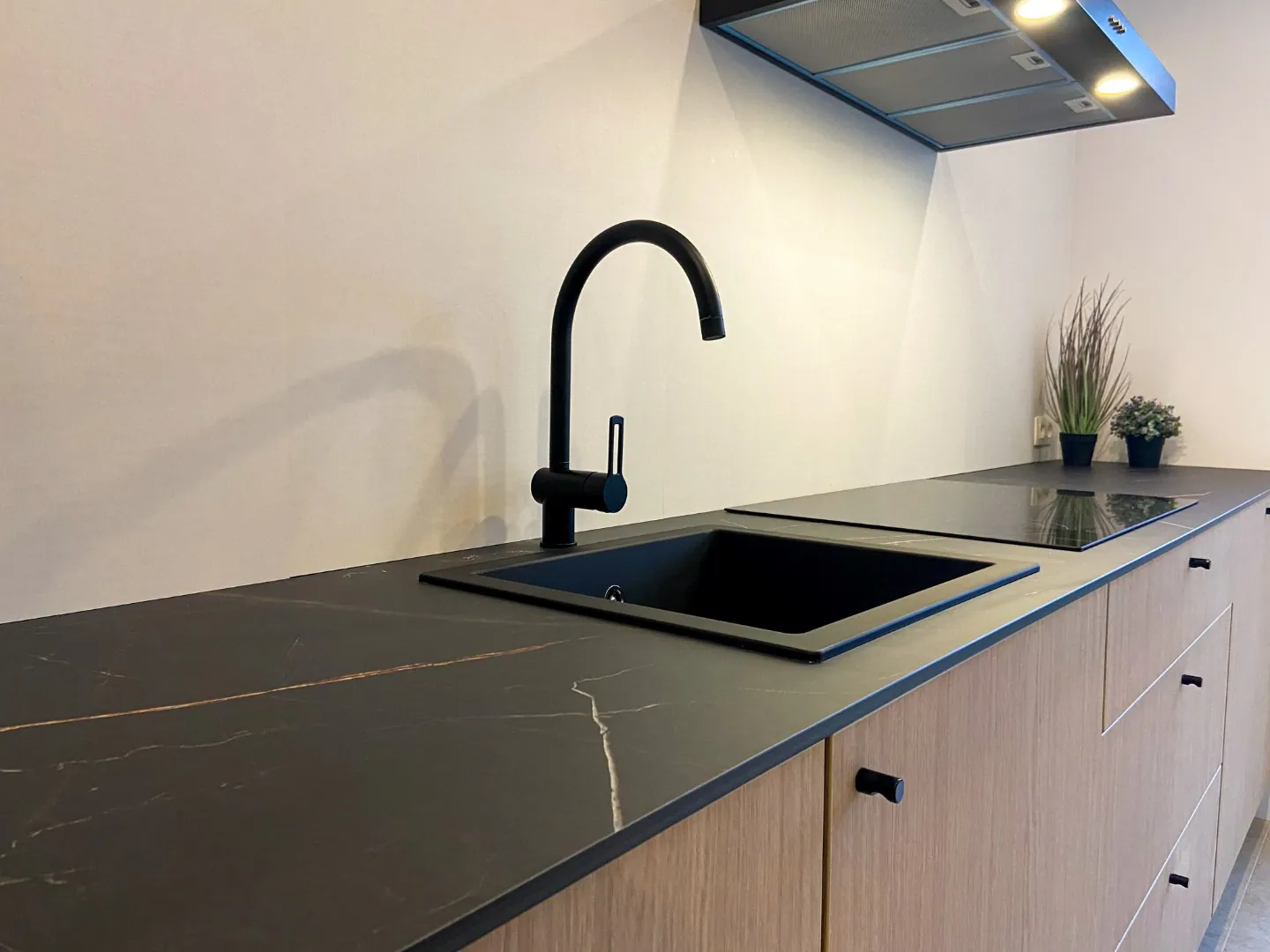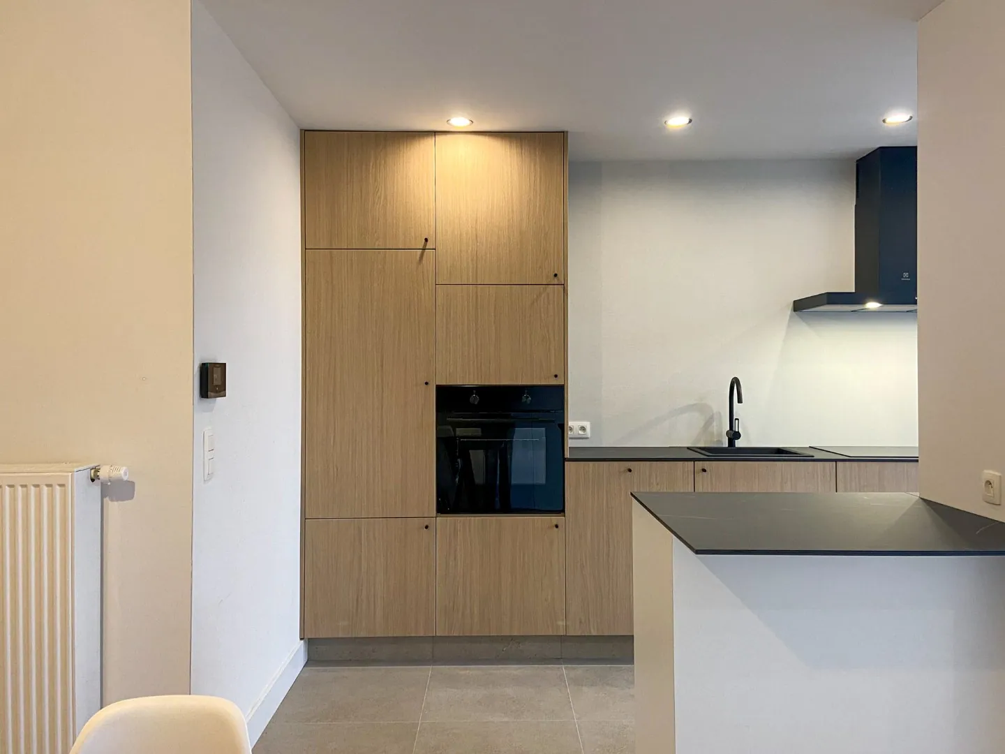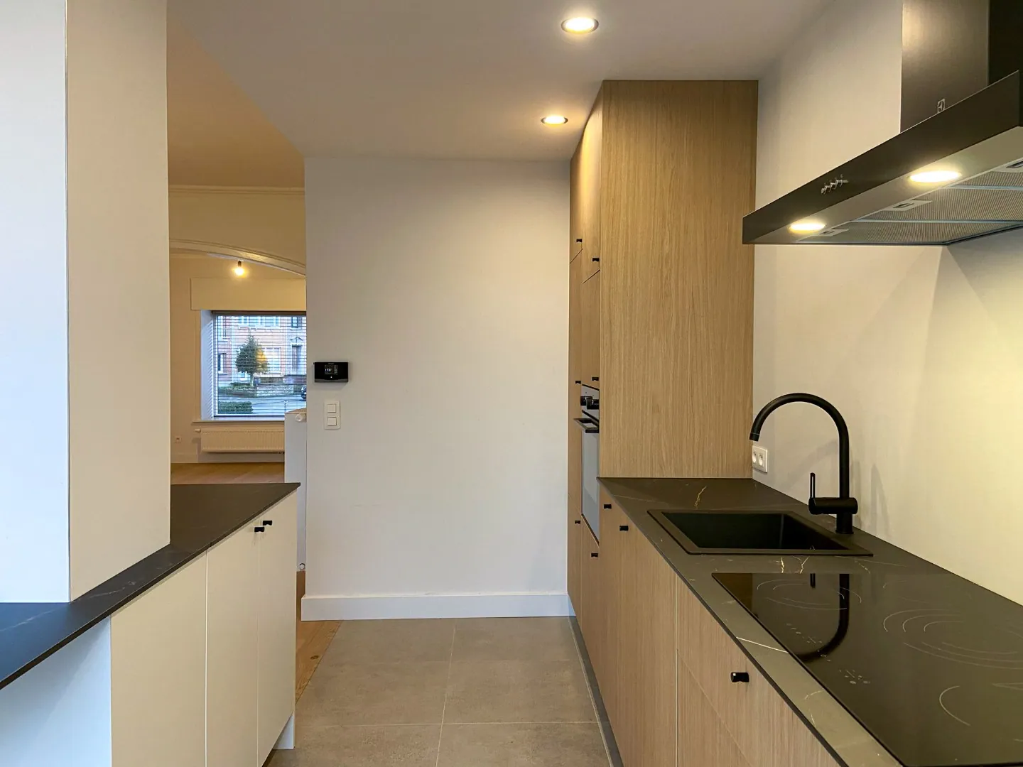 - een volledig vernieuwde keuken uitgerust met volkern werkblad, zwarte spoelbak en kwalitatieve toestellen waaronder een vitrokeramische kookplaat, combi-oven, decoratieve dampkap, vaatwasser en inbouwkoelkast.