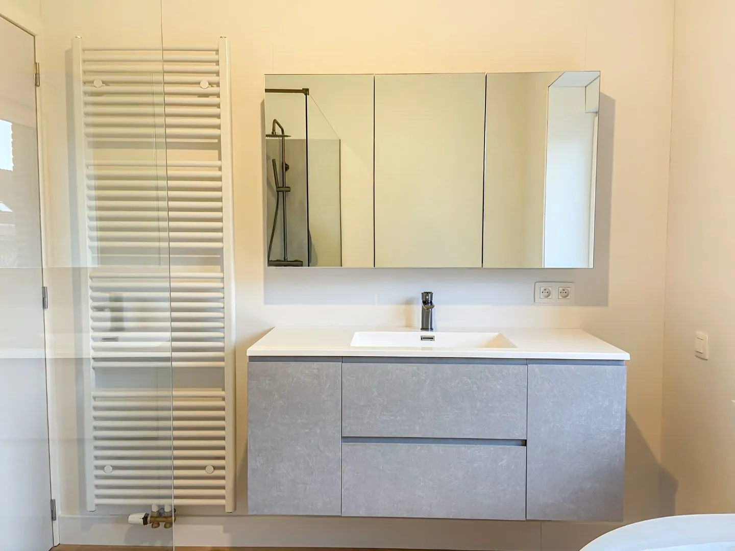 - een badkamer met lavabomeubel, bad en inloopdouche