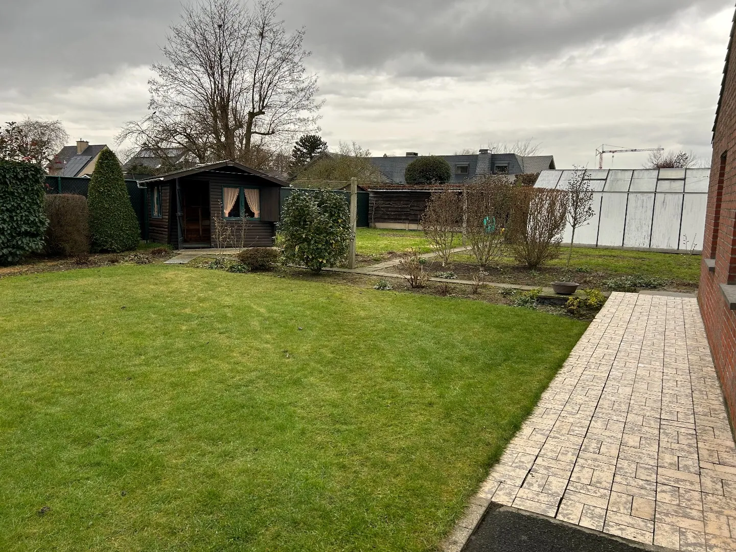 West georiënteerde tuin met tuinhuis, serre en houtberging.