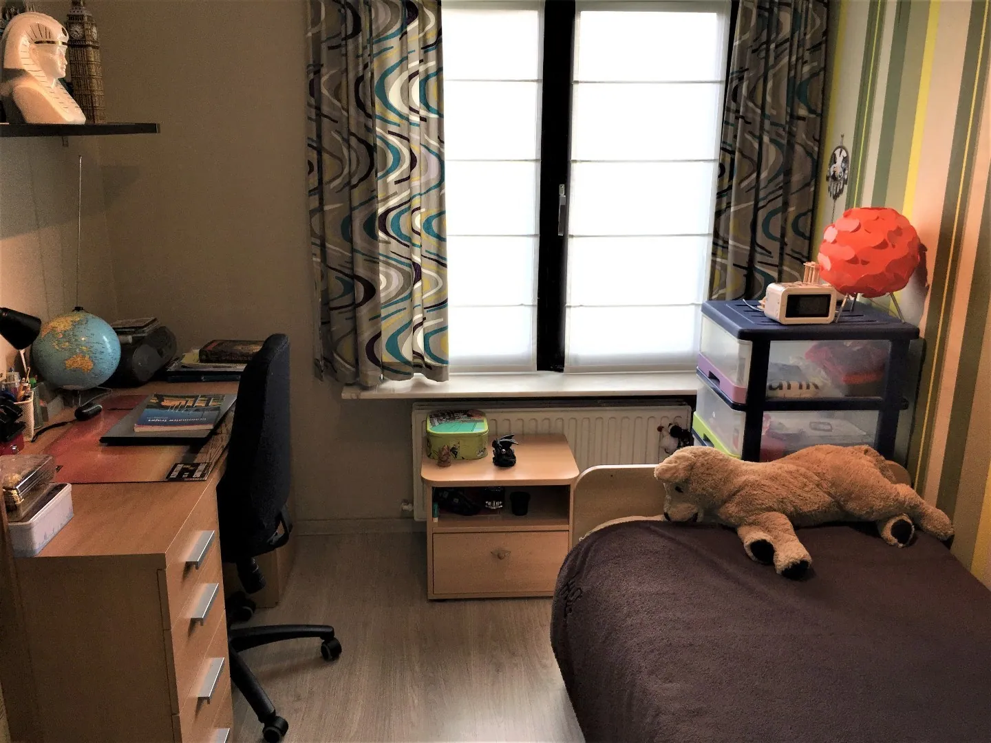 Inkomhal, gastentoilet, lichtrijke leefruimte met eet -en zithoek, grote keuken, garage, 3 volwaardige slaapkamers, bureau of dressing, badkamer met lavabomeubel en douche.