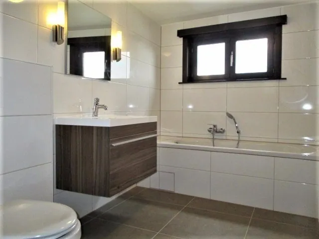 - Ingerichte badkamer met bad, lavabo en toilet