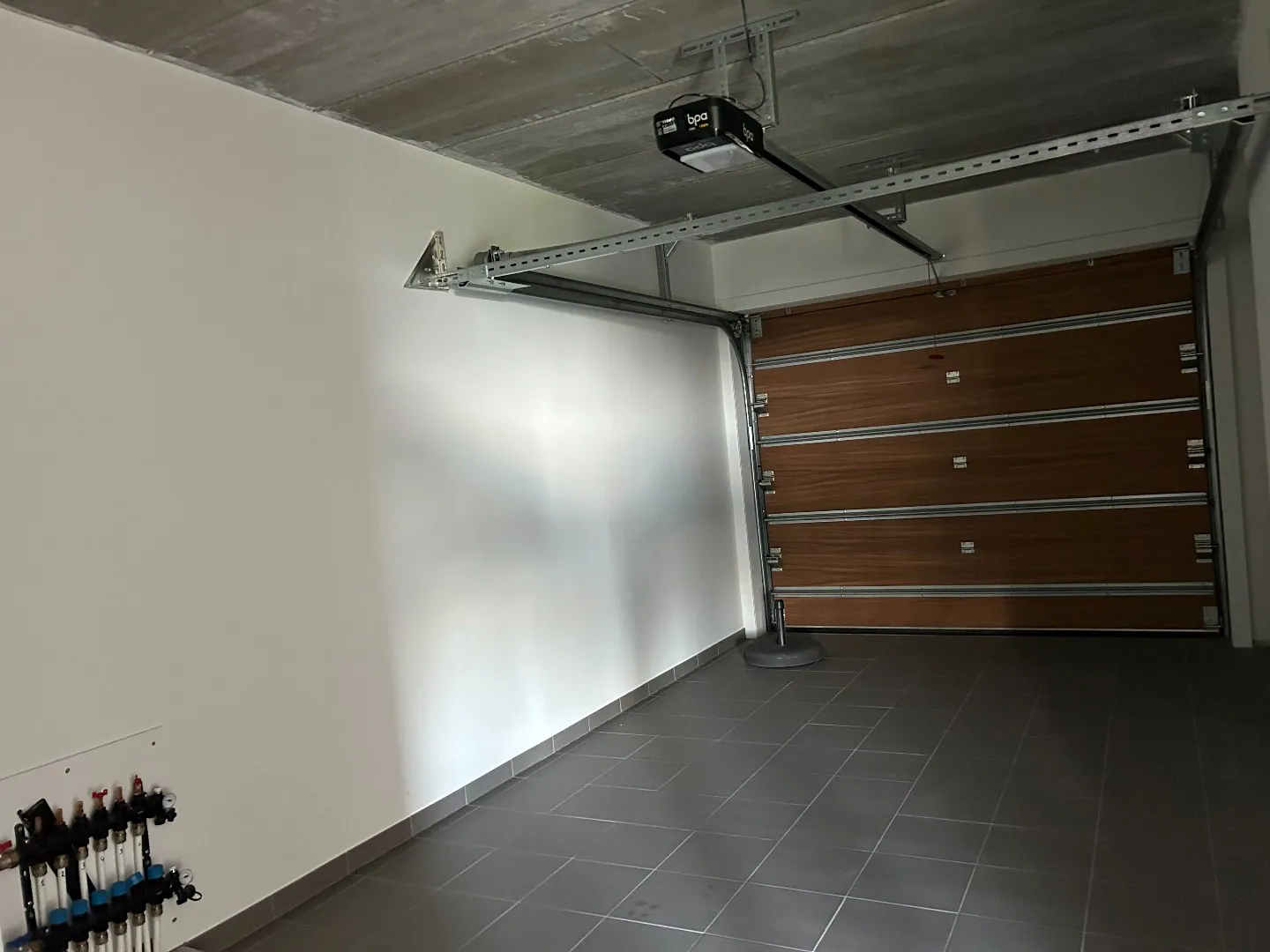 Beneden is er een inkomhal met gastentoilet, L-vormige leefruimte met bureauhoek en volledig geïnstalleerde open keuken en een ruimte garage.