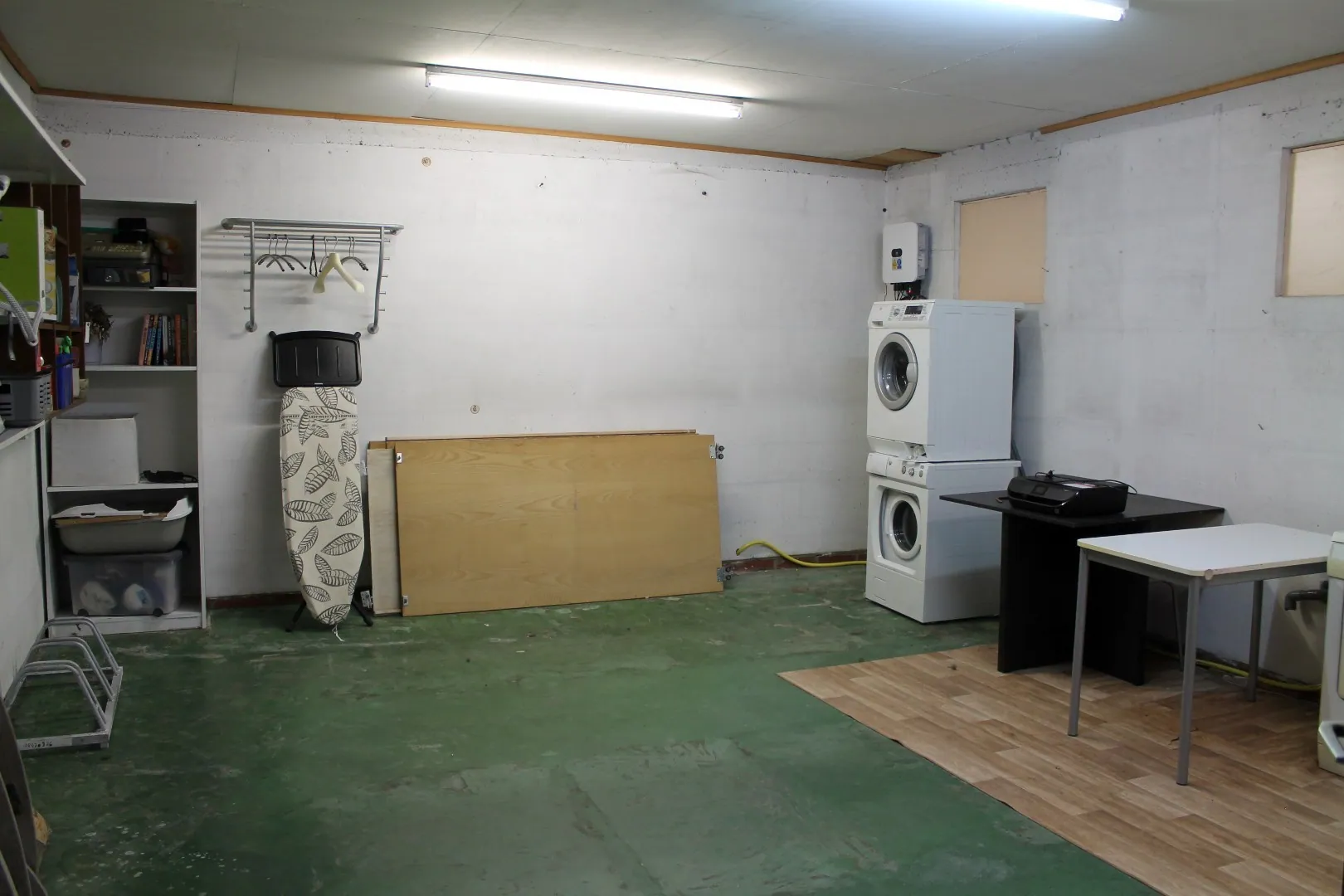 Er is een garage en grote wasplaats/bergruimte.