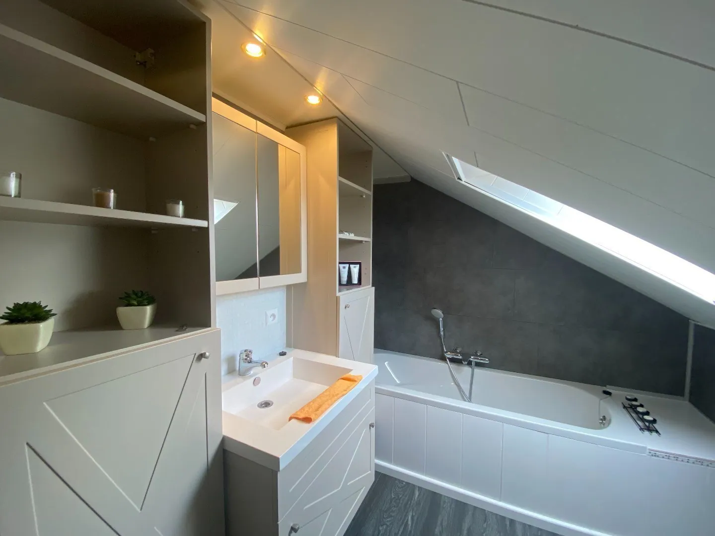 Op de bovenverdieping bevindt zich een volledig ingerichte studio met slaaphoek, kitchenette en eigen badkamer.