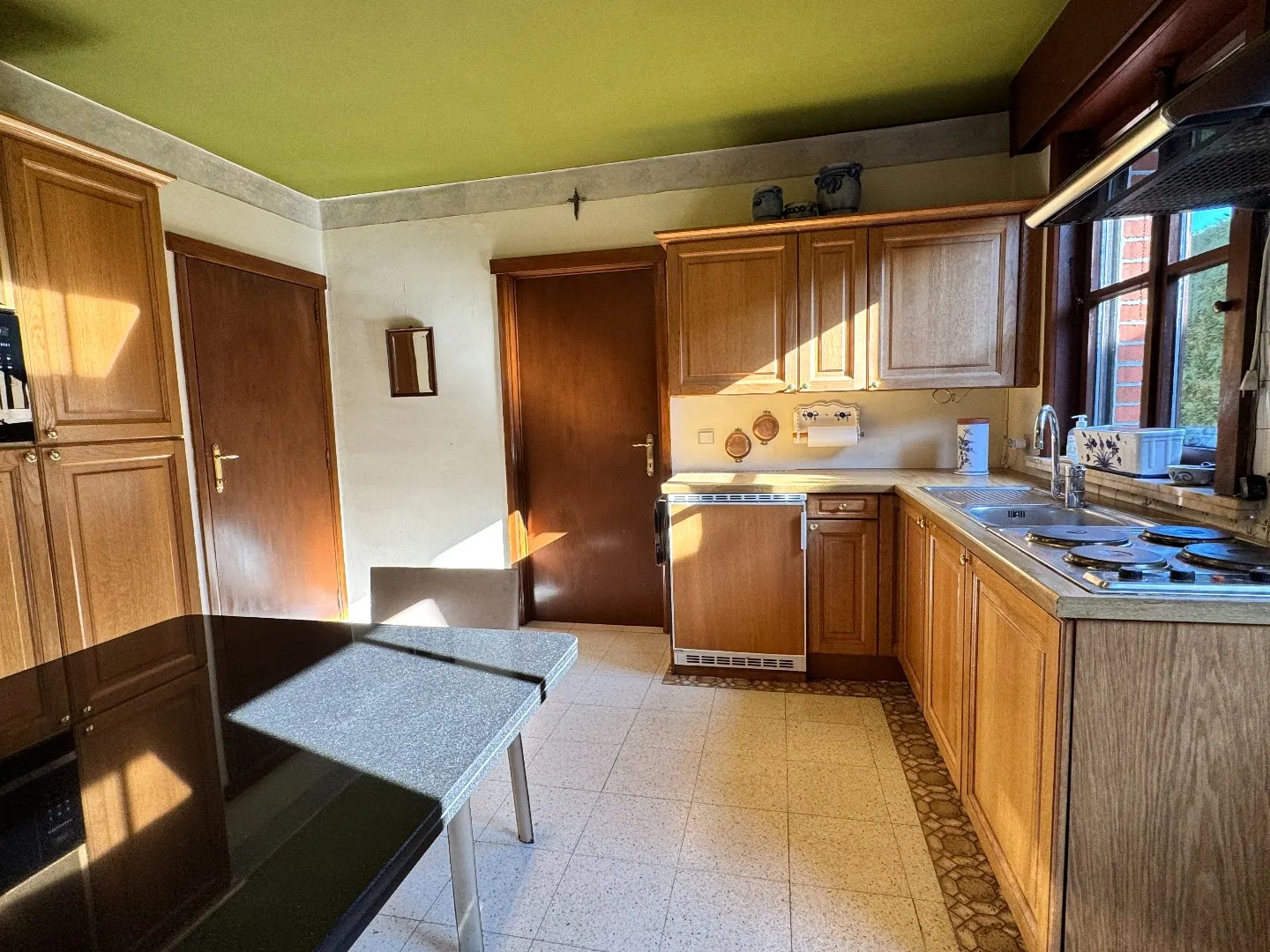 De keuken is praktisch ingericht en staat in verbinding met de leefruimte. Daarnaast beschikt de keuken over een extra bergruimte en een achterdeur die toegang geeft tot de zijkant van het perceel.