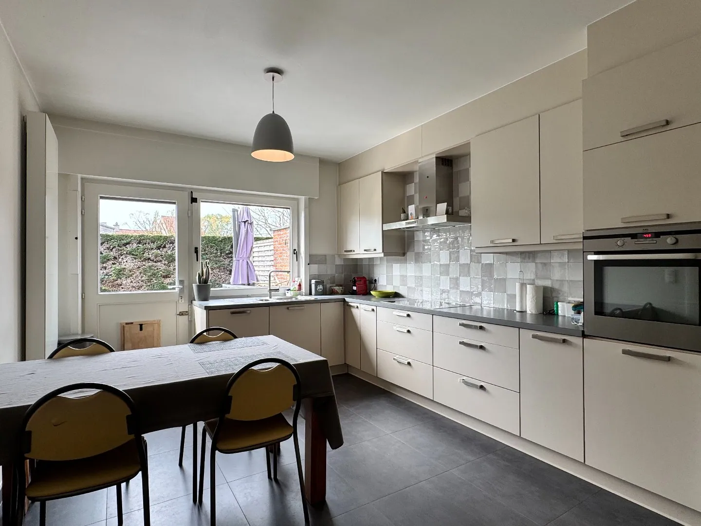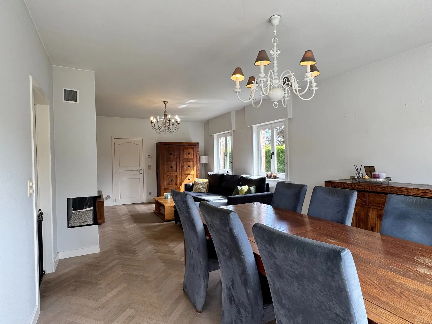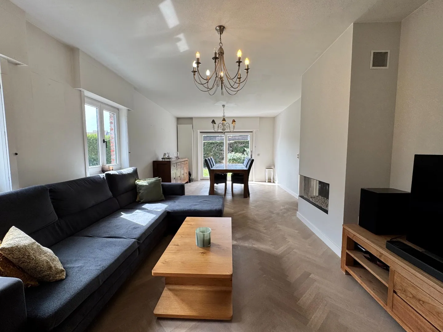 U komt de woning binnen via de inkomhal, die toegang biedt tot het gastentoilet met lavabo, de inpandige garage en de leefruimte. De gezellige leefruimte geniet van veel natuurlijke lichtinval en biedt een mooi zicht op de tuin. De gashaard en de visgraatvloer zorgen hier voor een warme en huiselijke sfeer. Aansluitend bevindt zich de ruime, volledig uitgeruste keuken met veel opbergruimte en een directe toegang tot het terras. Onder de trap is er bovendien een praktische berging voorzien.