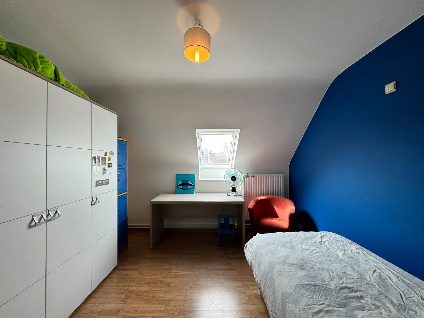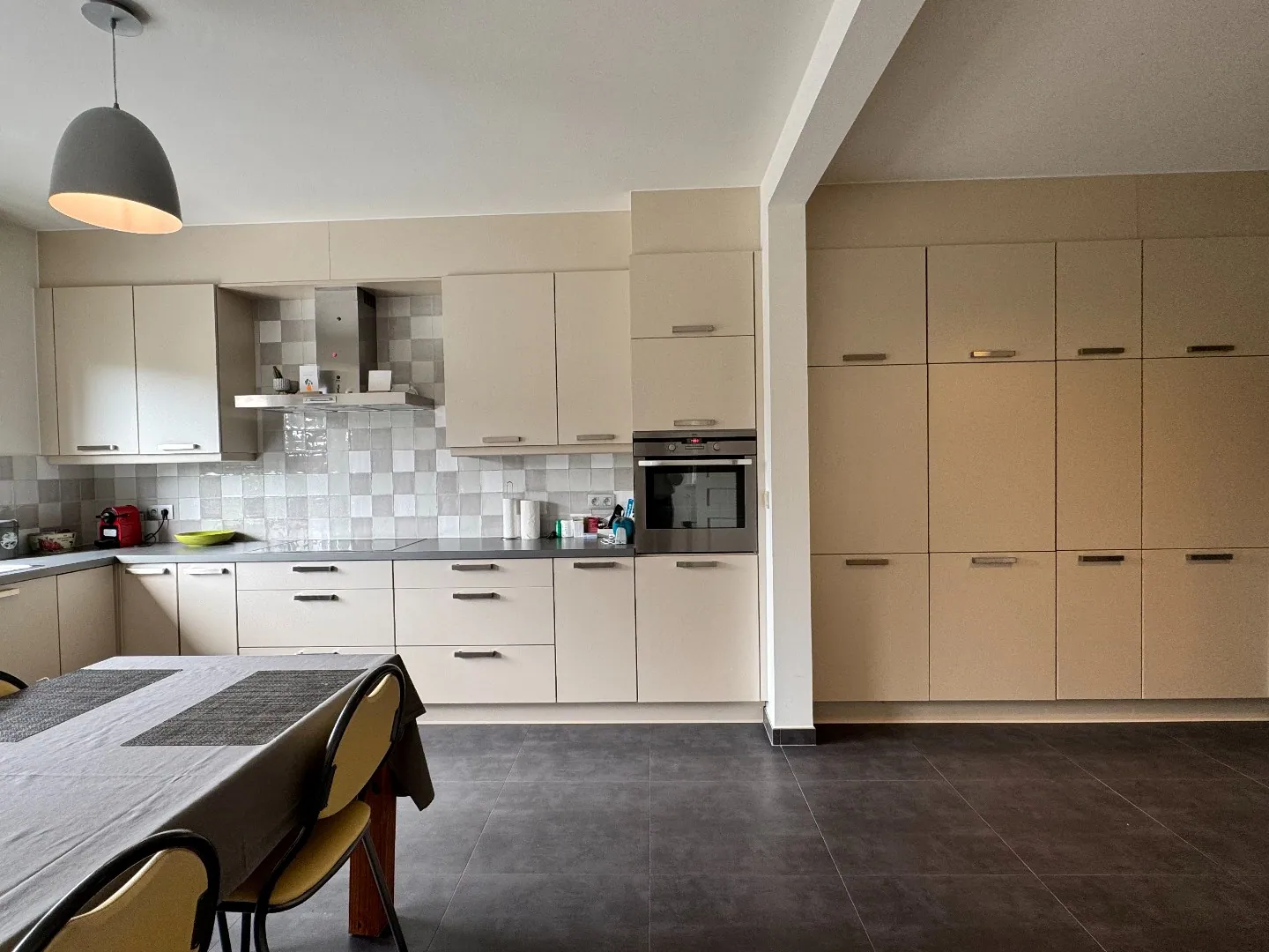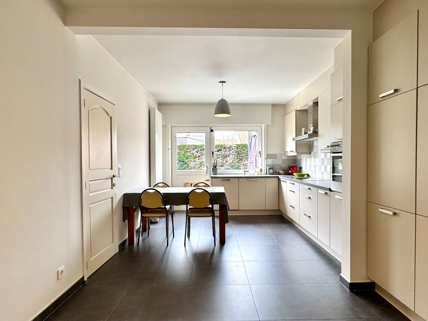 U komt de woning binnen via de inkomhal, die toegang biedt tot het gastentoilet met lavabo, de inpandige garage en de leefruimte. De gezellige leefruimte geniet van veel natuurlijke lichtinval en biedt een mooi zicht op de tuin. De gashaard en de visgraatvloer zorgen hier voor een warme en huiselijke sfeer. Aansluitend bevindt zich de ruime, volledig uitgeruste keuken met veel opbergruimte en een directe toegang tot het terras. Onder de trap is er bovendien een praktische berging voorzien.