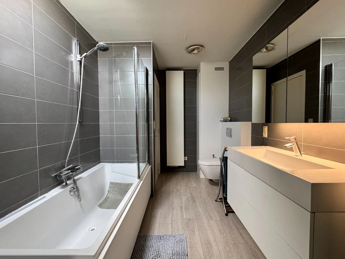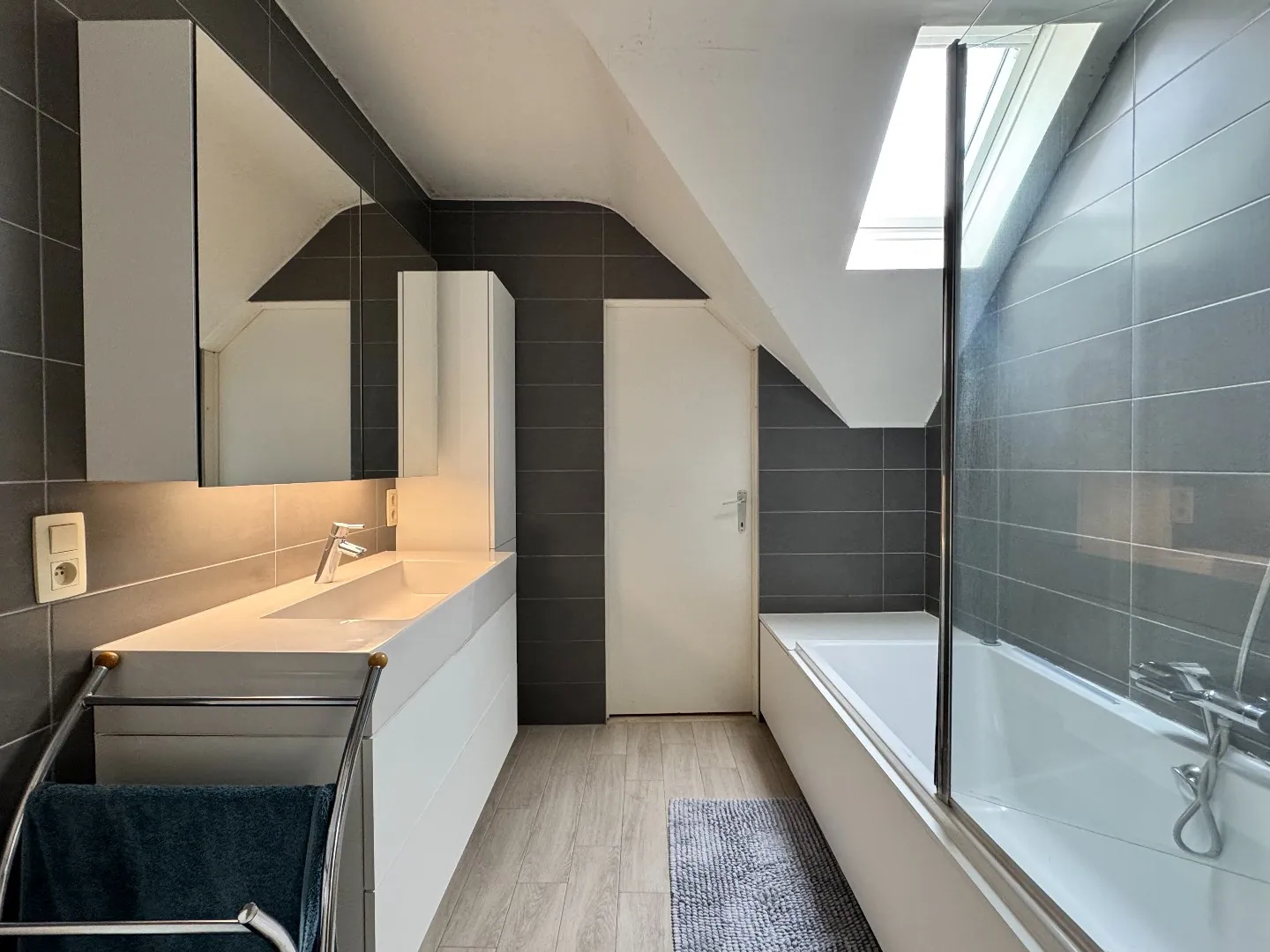 Op het eerste verdiep komt u in de nachthal die uitgeeft op drie volwaardige slaapkamers en een ruime badkamer. De vernieuwde badkamer is uitgerust met een lavabo, ligbad met douchemogelijkheid en toilet. Aansluitend aan de badkamer bevindt zich nog een extra berging met ingebouwde kasten. Via een valtrap in de nachthal bereikt u de zolder, die bijkomende opslagmogelijkheden biedt.