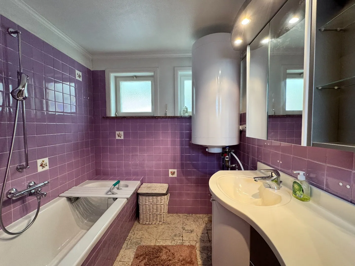 Op het gelijkvloers beschikt de woning verder nog over een badkamer en een extra kamer. Deze ruimte wordt vandaag gebruikt als slaapkamer, maar kan evengoed ingericht worden als bureau, wasplaats of hobbyruimte.